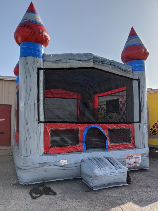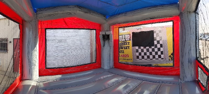 The 13 foot by 13 foot Bounce House includes a basketball hoop inside with a large bouncing floor. We have four designs so you are sure to find one to match the theme of your party!