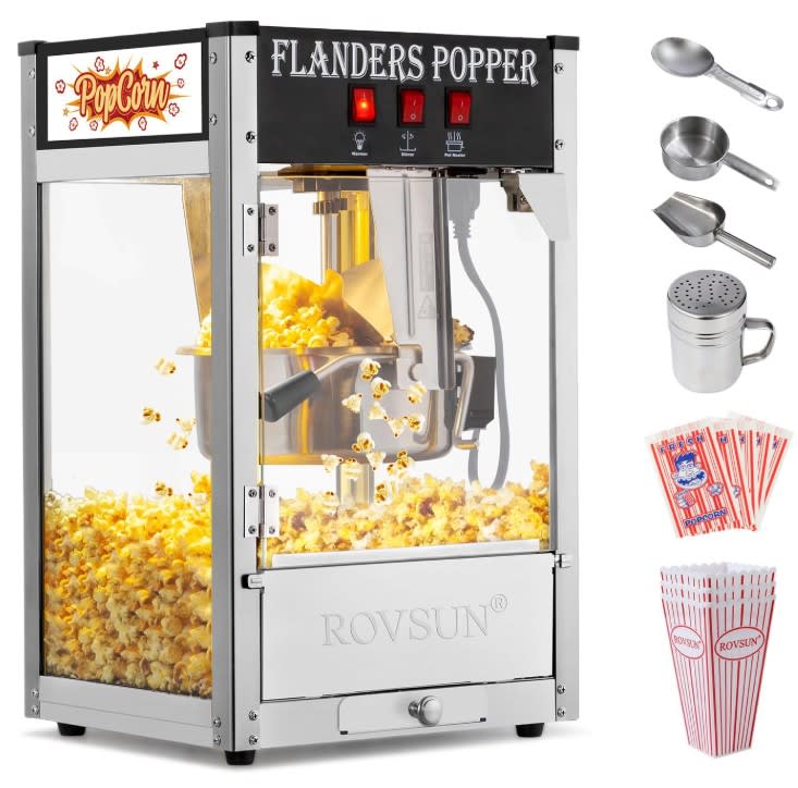 Ready to use right away — the Popcorn Machine 8 oz comes with a popcorn scoop, oil measuring spoon, corn measuring spoon, three popcorn cups, a power shaker, and 30 popcorn bags. Everything you need to start popping and serving immediately.