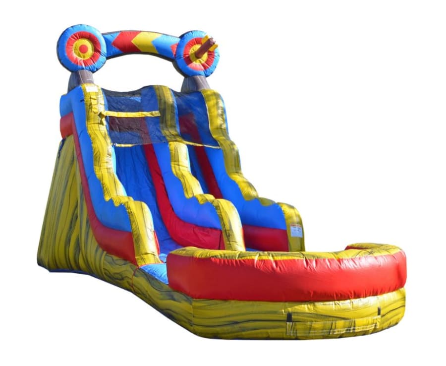 The 15 foot tall bullseye archery themed water slide is excellent for any event ready to bring the targets and arrows!. With an full depth pool. there is room for everyone to have a great time on this unique archery style unit! Can't wait to bring this bullseye slide into your next party or event! The yellow based slide features two large archery targets, one of which has the arrow right down the middle.