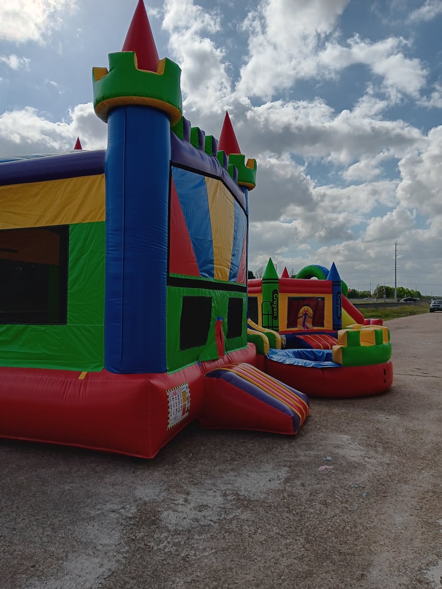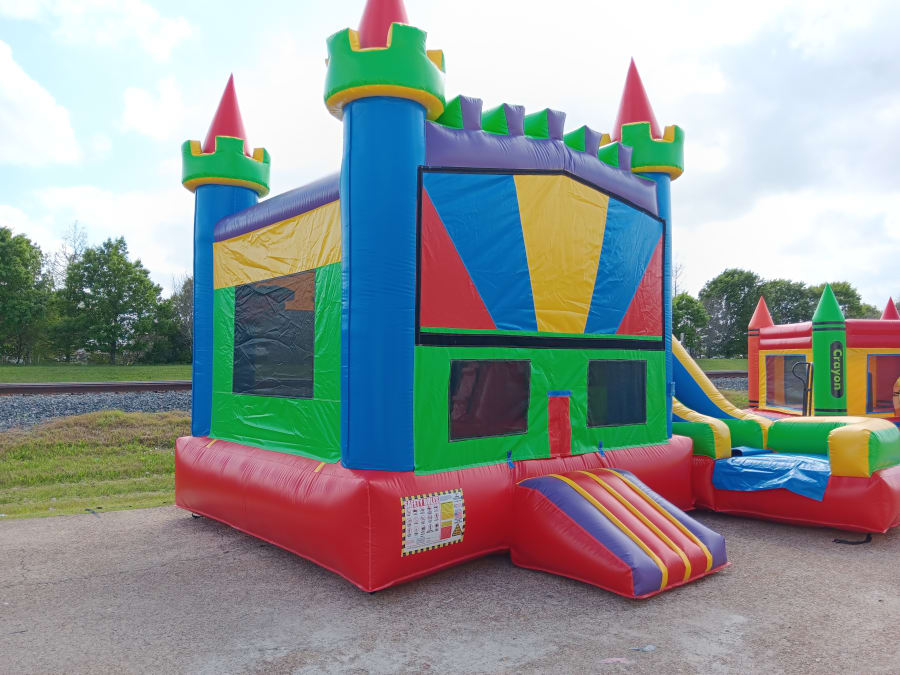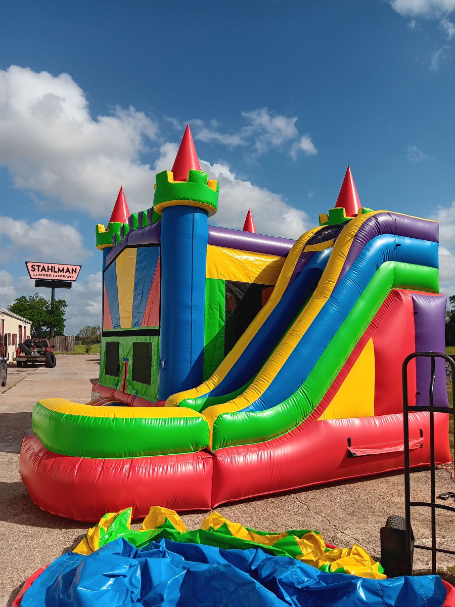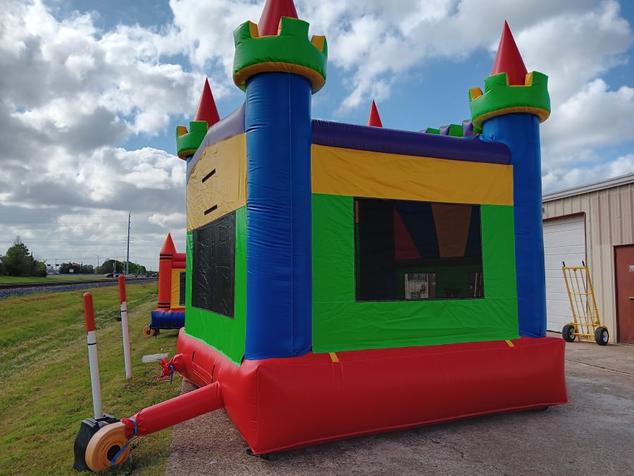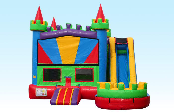 Our 5-1 Rainbow Mod Combo is the next step up! This commercial grade jumper combo for sale features an exciting variant color scheme, bricks, accommodations for company banners/art panels and an inflatable basketball hoop inside!