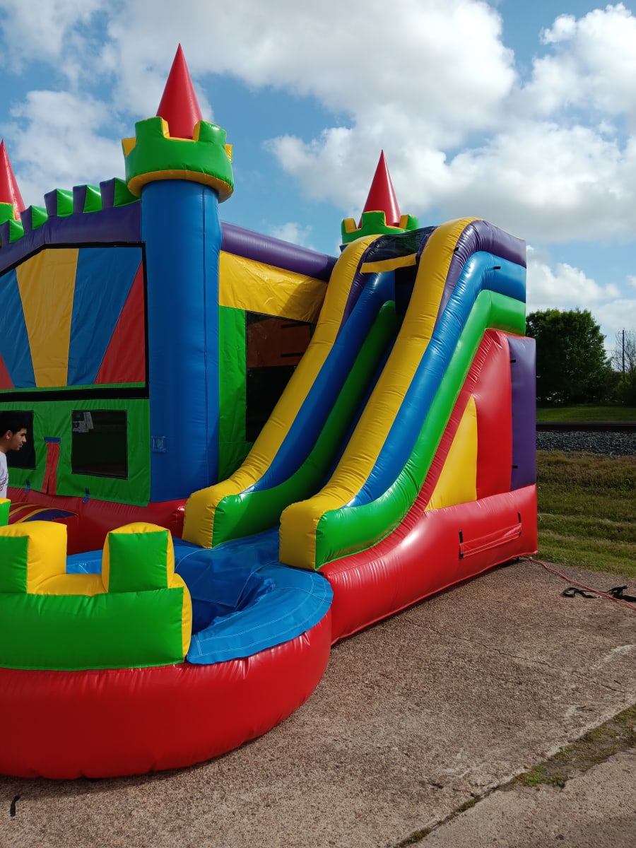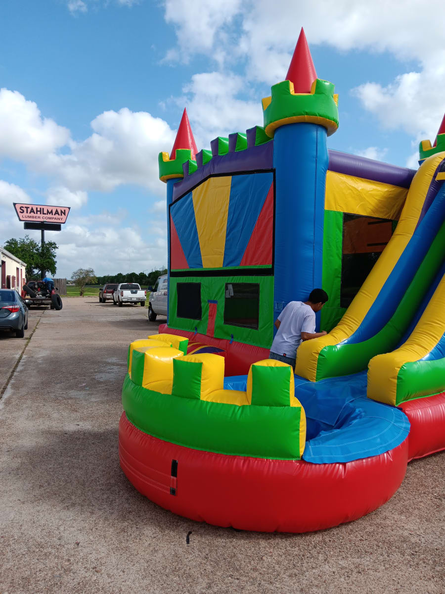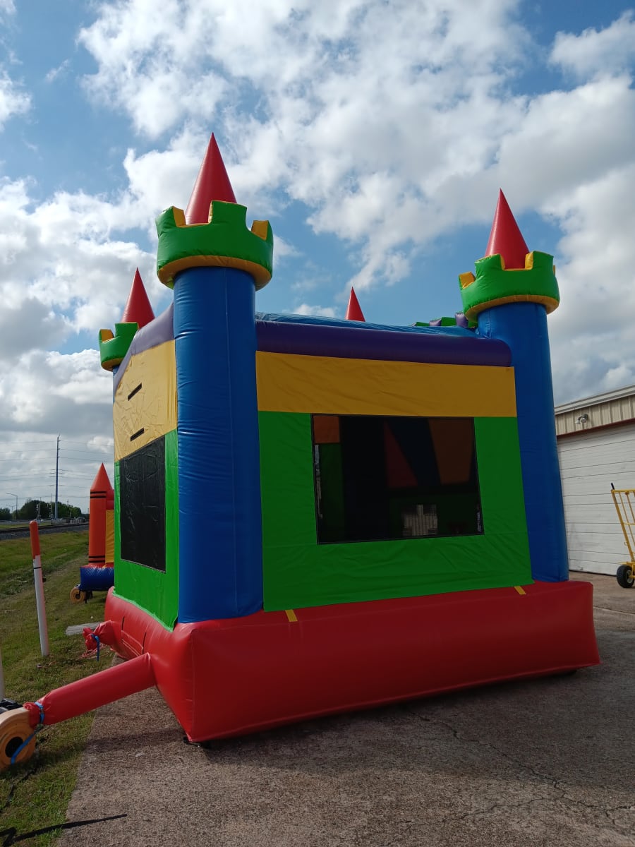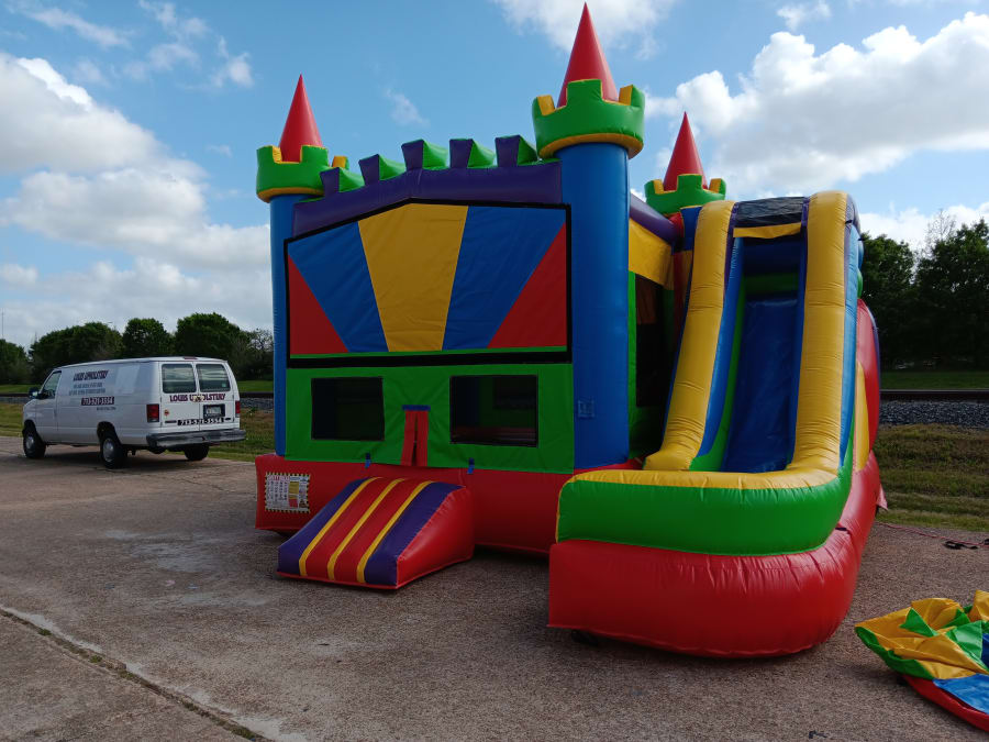 Our 5-1 Rainbow Mod Combo is the next step up! This commercial grade jumper combo for sale features an exciting variant color scheme, bricks, accommodations for company banners/art panels and an inflatable basketball hoop inside!
